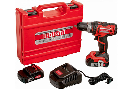 Аккумуляторная дрель-шуруповерт Felisatti ДА-13/18Л3(М) 3840.5.1.10. Быстрозажимной патрон 1.5-13 мм. 2 режима скорости. Светодиодная подсветка рабочей зоны. Два Li-ion аккумулятора емкостью 2,0 А/ч. Крутящий момент 36 Нм. Кейс.